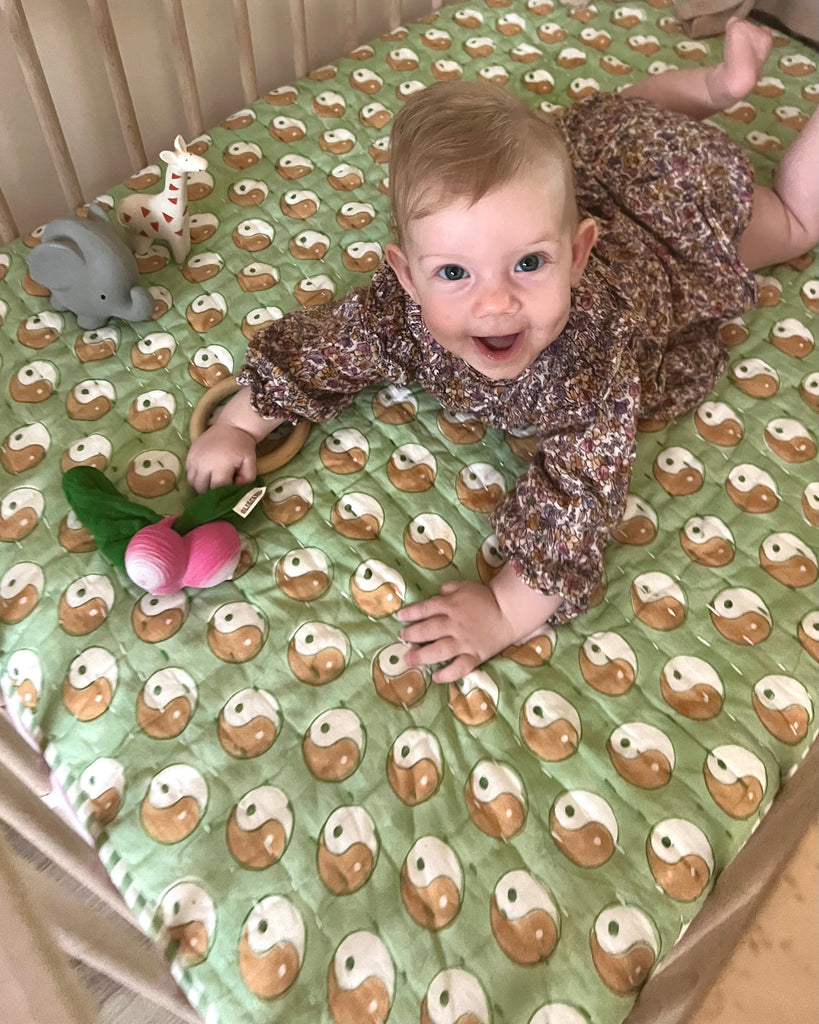 Handgemaakt deken van 100% katoen met YinYang print in de kleur groen. Dit deken heeft het perfecte formaat voor gebruik in de wieg, ledikant, kinderwagen of als speelkleed in de box. De achterkant heeft een streepjes print dus je kunt het dekentje aan beide kanten gebruiken. Combineer met het YinYang Sage Hoeslaken & YinYang Sage Kussen.