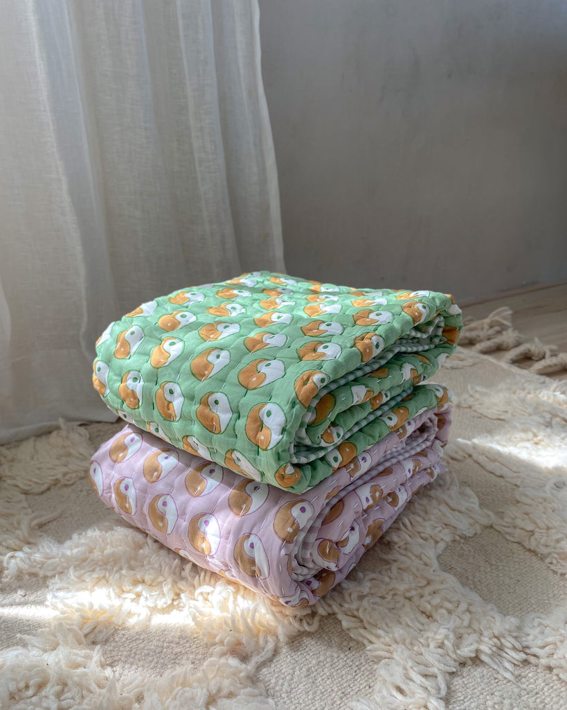 Let op: houd er rekening mee dat onze dekentjes met de hand worden gemaakt en daarom kleine imperfecties kunnen vertonen, zoals variaties in kleur/print of stiksels. Dit draagt bij aan de unieke charme van elk exemplaar. Mocht er een stiksel losraken, dan kun je dit eenvoudig herstellen door er een klein knoopje in te leggen.